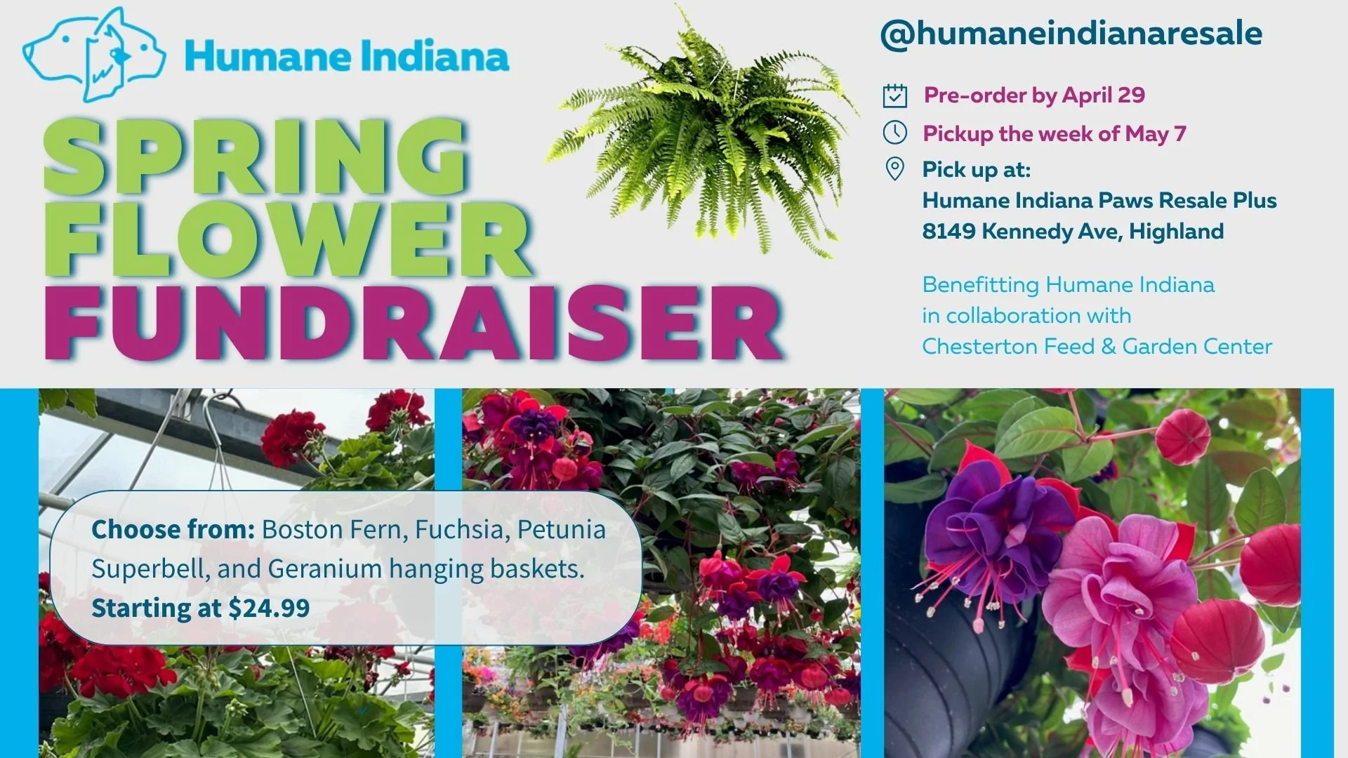 Order your hanging flower baskets today! This fundraiser benefits the animals of Humane Indiana, with flowers provided by Chesterton Feed & Garden Center.